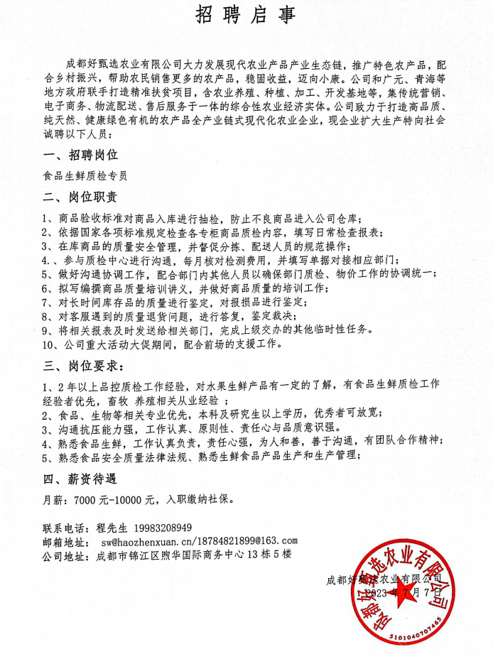 就业信息:成都好甄选农业有限公司招聘
