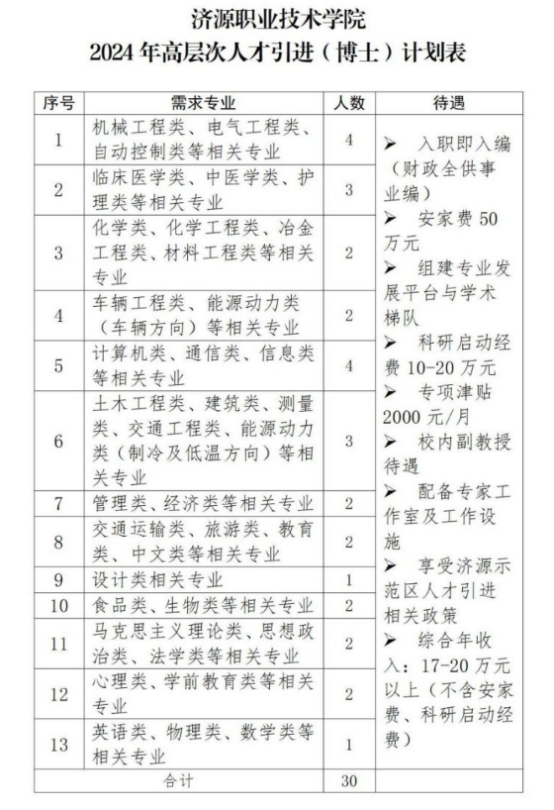 3.博士:数量及待遇详见《济源职业技术学院2024年高层次人才引进(博士)计划表》。