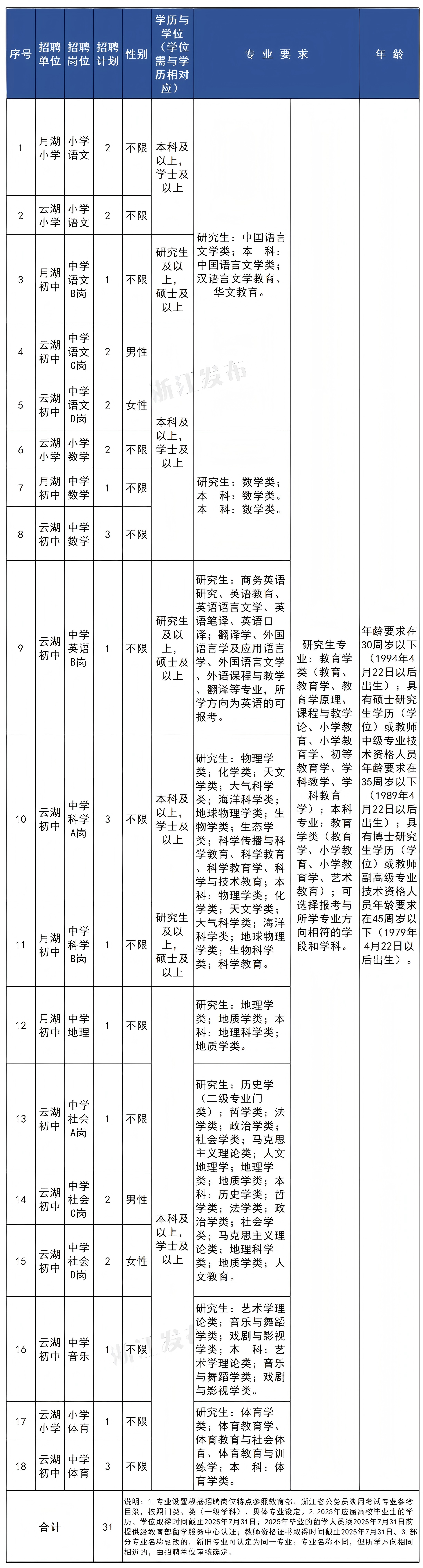 本次计划招聘中小学事业编制学科教师31名。