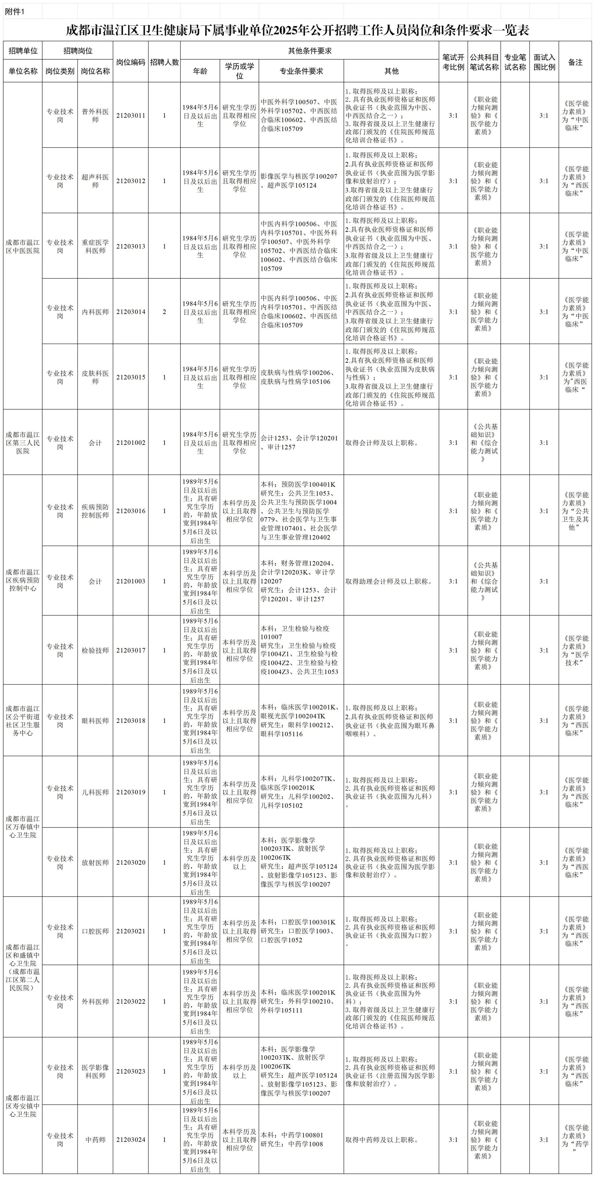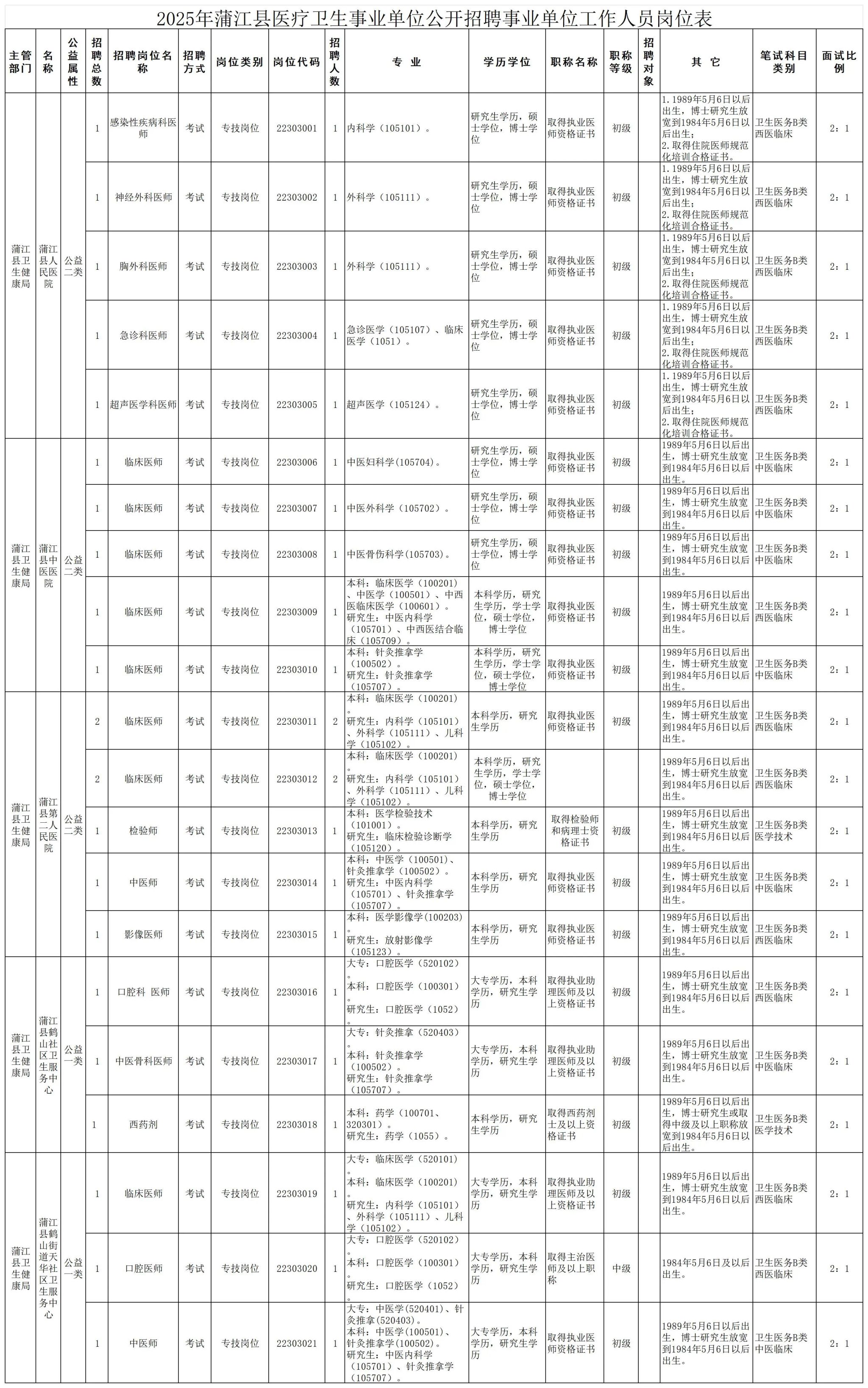 招聘岗位及名额:蒲江县现面向社会公开招聘事业单位工作人员14名;蒲江县医疗卫生事业单位现面向社会公开招聘事业单位工作人员23名。