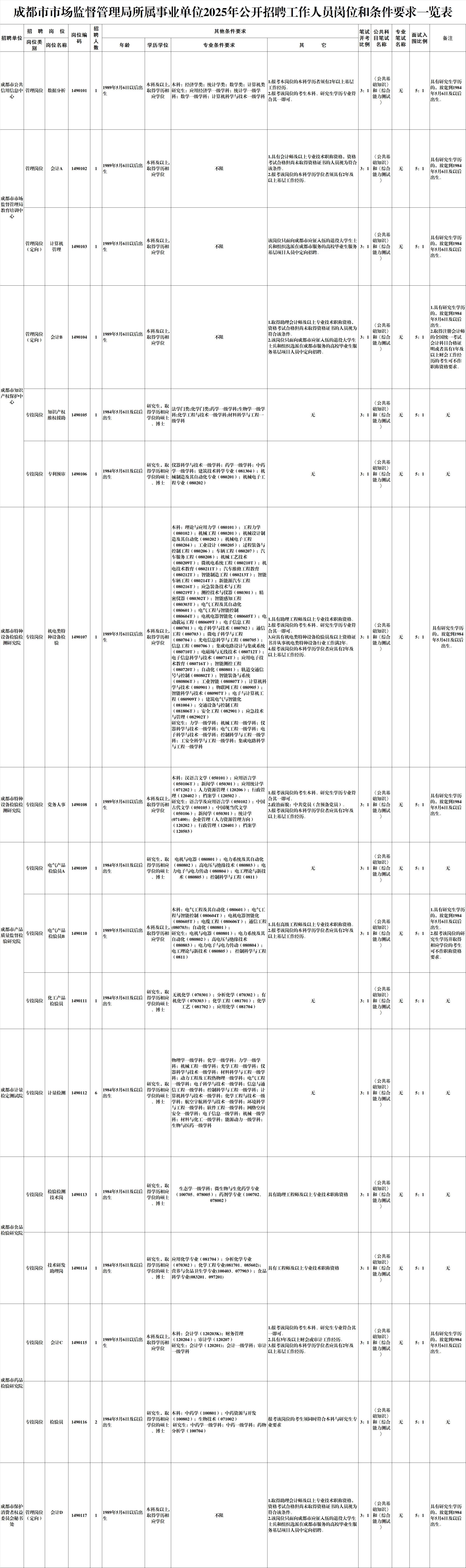 招聘岗位及名额:成都市市场监督管理局所属9家事业单位面向社会公开招聘工作人员23名。