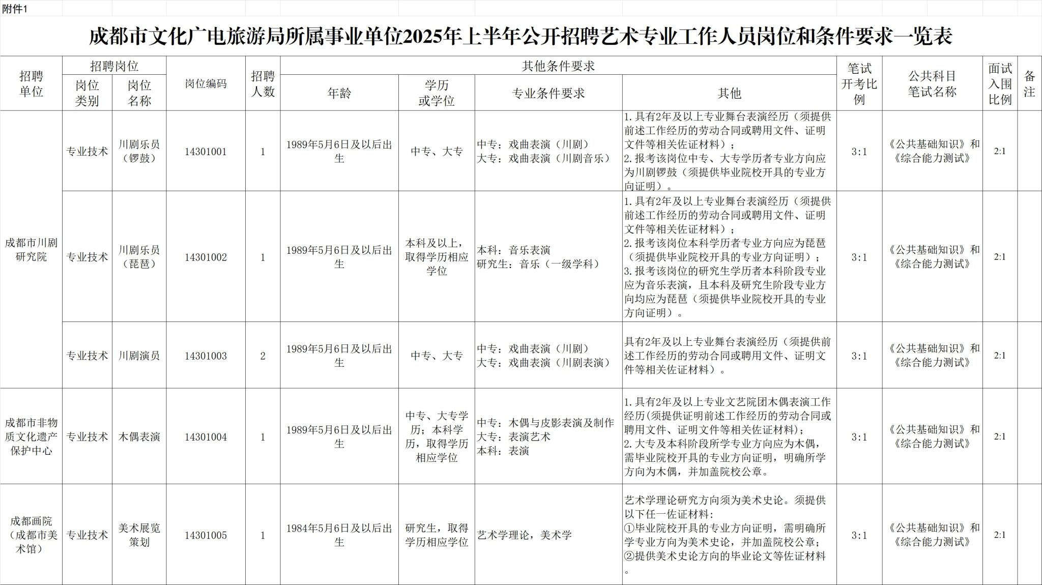 招聘岗位及名额:成都市文化广电旅游局所属3家事业单位面向社会公开招聘艺术专业工作人员6名。
