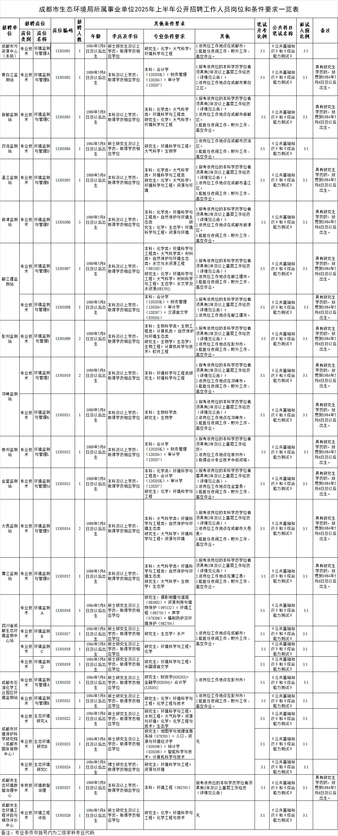 招聘岗位及名额:成都市生态环境局面向社会公开招聘工作人员32名。