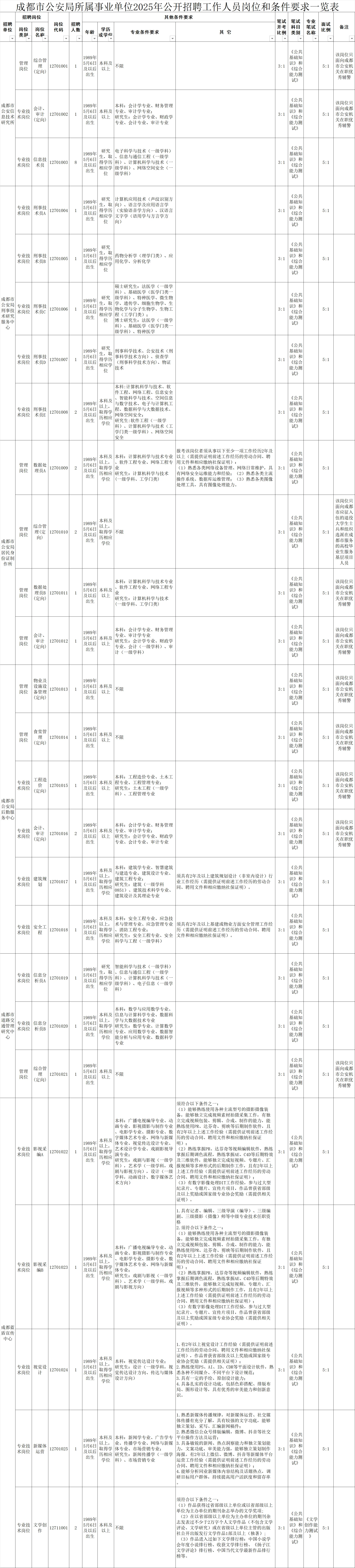 招聘岗位及名额:成都市公安局所属6家事业单位面向社会公开考试招聘工作人员38名。