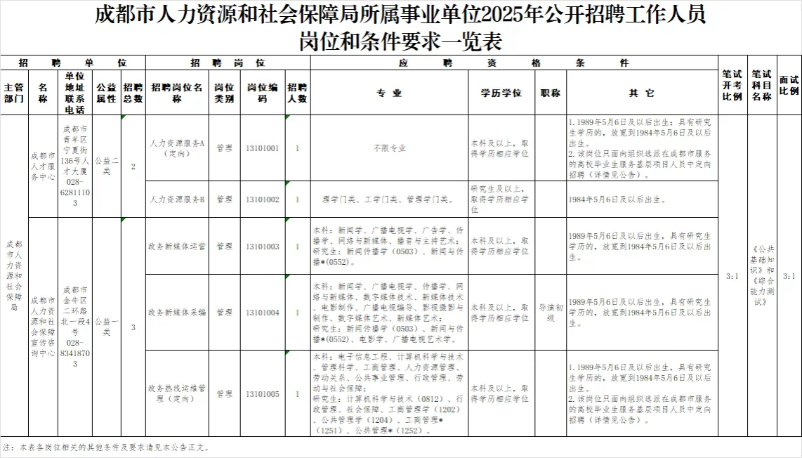 招聘岗位及名额:成都市人力资源和社会保障局所属成都市人才服务中心等2家单位面向社会公开招聘工作人员5名。