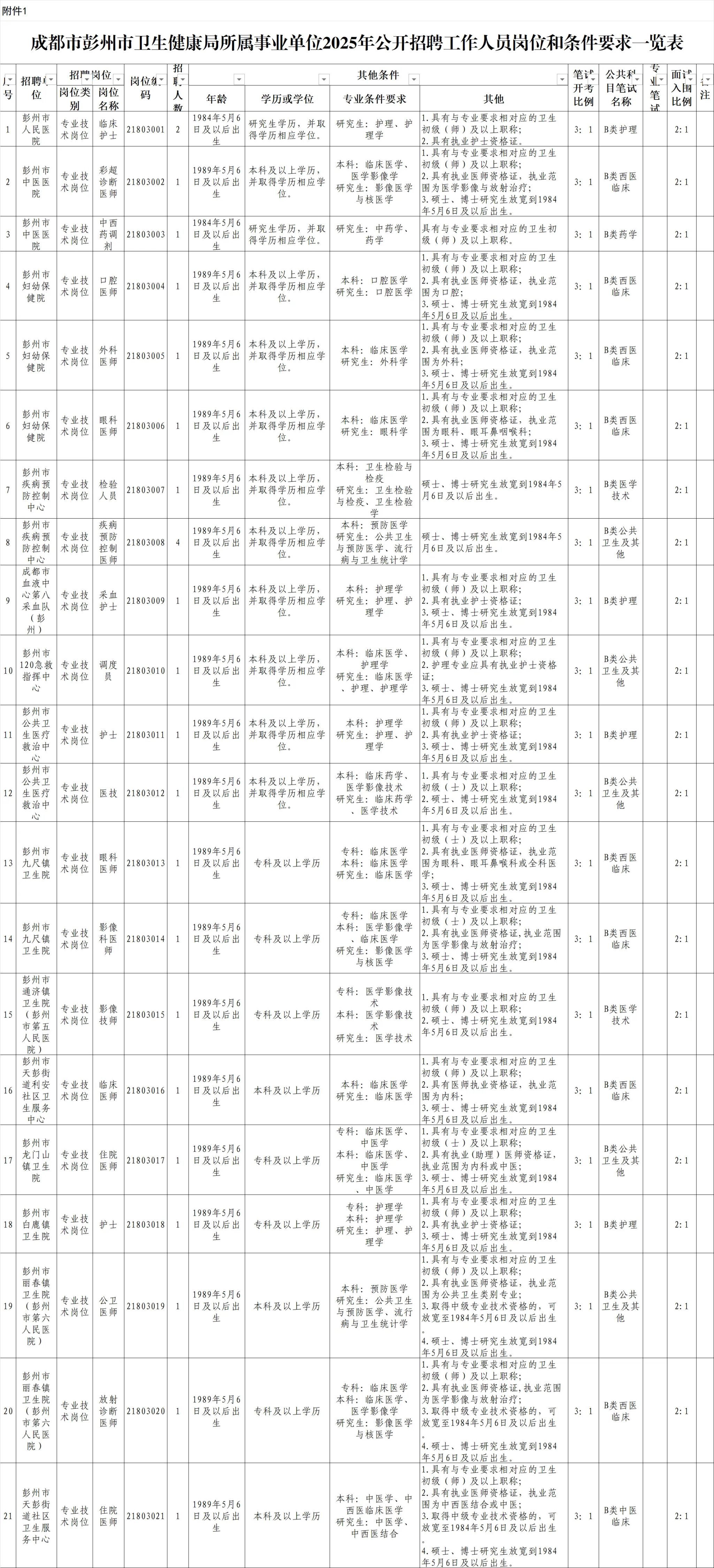 招聘岗位及名额:彭州市面向社会公开招聘工作人员45名;彭州市卫生健康局所属事业单位面向社会公开招聘工作人员25名。