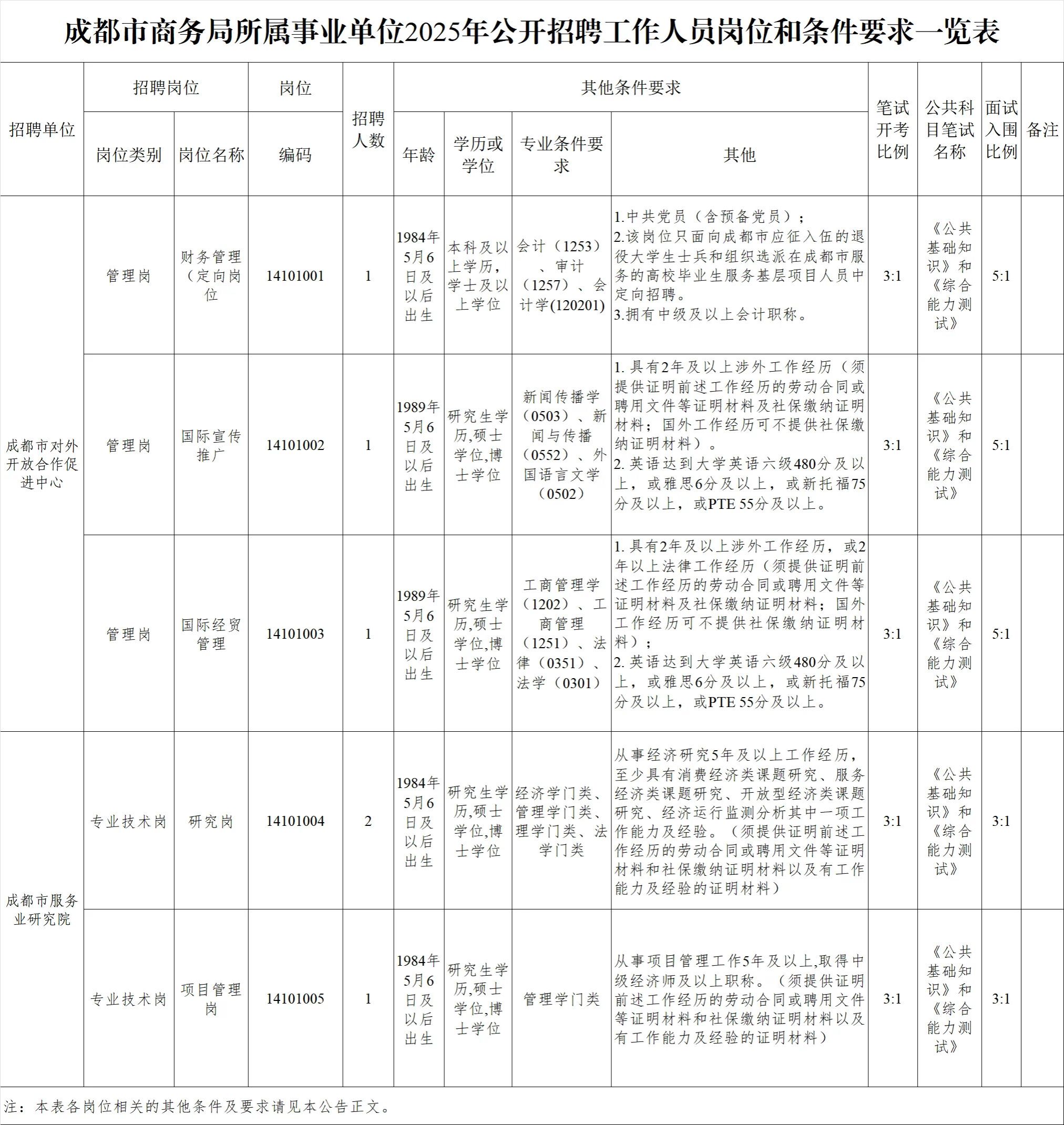 招聘岗位及名额:成都市商务局所属事业单位面向社会公开招聘工作人员6名。