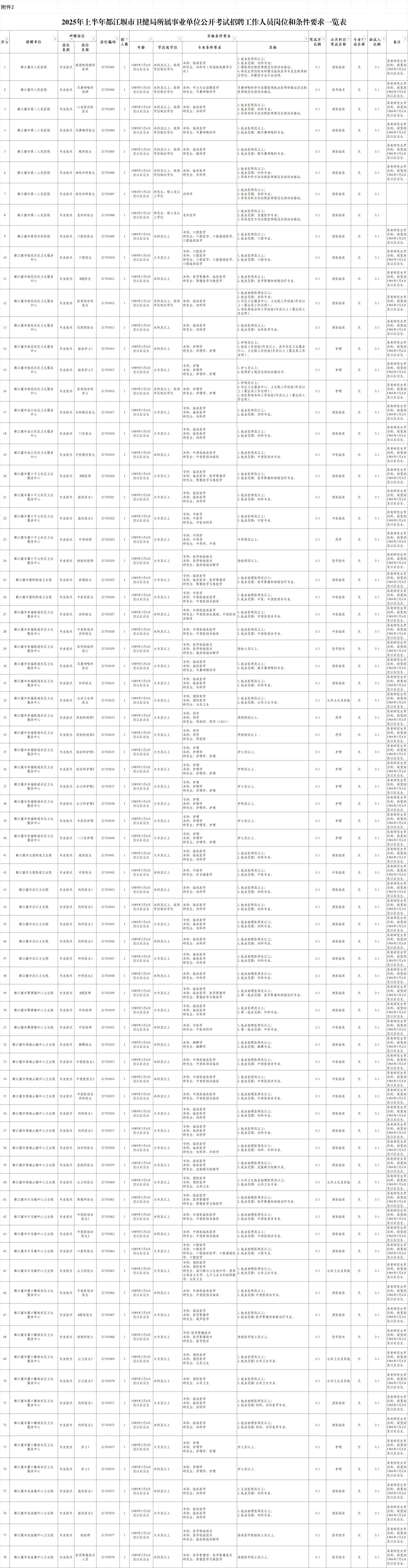 招聘岗位及名额:都江堰市卫生健康局(以下简称:都江堰市卫健局)所属事业单位面向社会公开考试招聘工作人员78名。