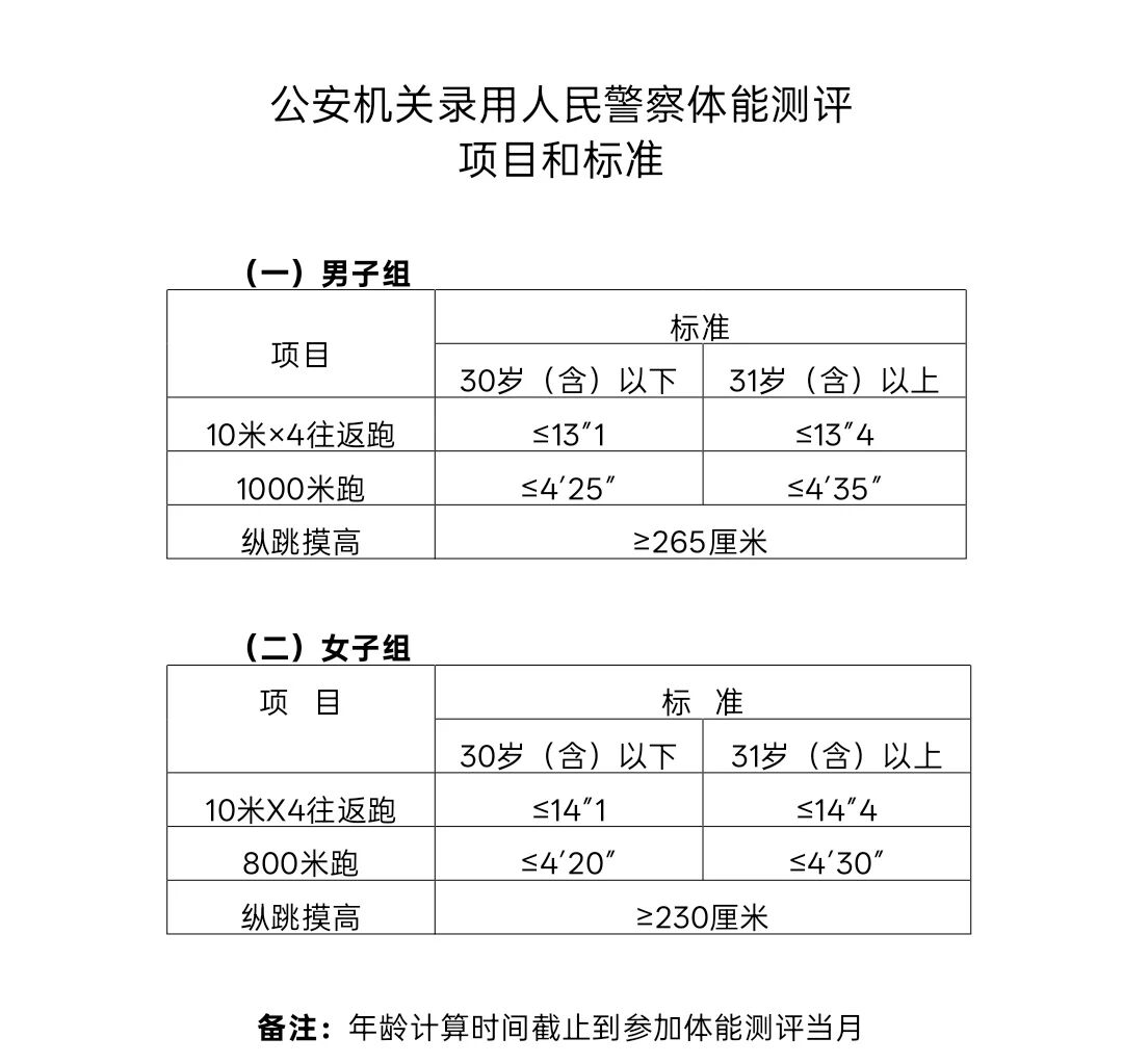 测评项目包括10米×4往返跑、纵跳摸高、1000米(男)或800米(女)跑3个项目,测评标准参照附件2《公安机关录用人民警察体能测评项目和标准》(公政治〔2024〕60号)执行。测评为非竞争性,任2项合格即通过,现场公布测评结果并经考生签字确认。若前两项达标,可不参加第三项测试。