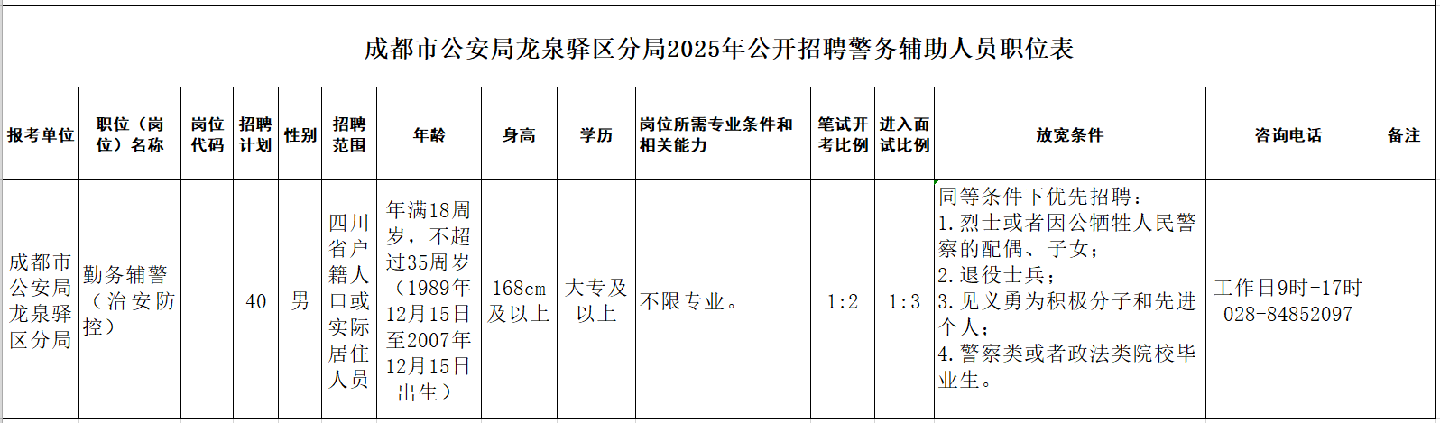 此次共计划招聘40名辅警。具体职位、名额和招聘要求详见附件1《成都市公安局龙泉驿区分局2025年公开招聘警务辅助人员职位表》(以下简称《职位表》)。