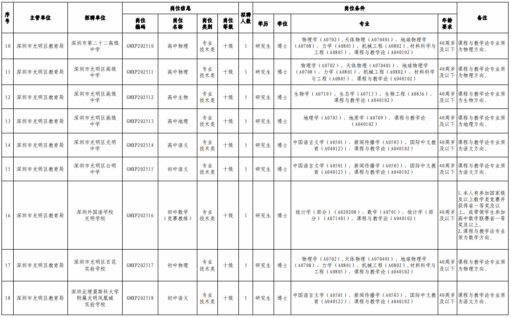 选聘岗位及具体要求详见《深圳市光明区事业单位2025年12月公开选聘博士岗位表》。