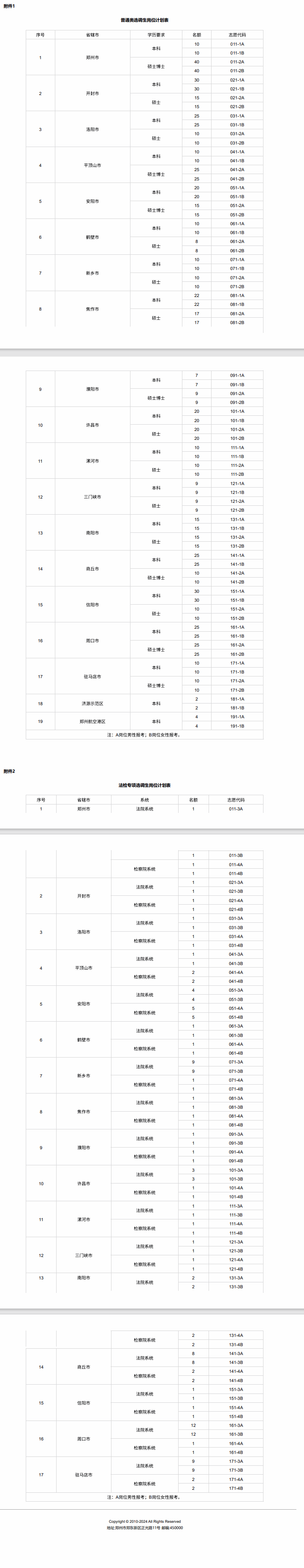 各省辖市(含济源示范区、郑州航空港区,下同)招录计划见附件1、2。