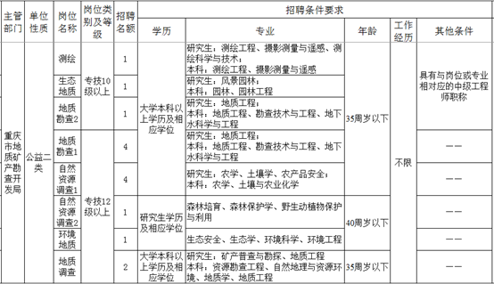 48日,重庆市人力资源和社会保障局发布了《2022年上半年重庆市属事业单位集中公开招聘工作人员公告》,607地质队共设置了8个岗位,招聘15名专业技术人员,其中专技十级3人,专技十二级12人(其中研究生学历及相应学位两人)。具体招聘单位、岗位详见附件。