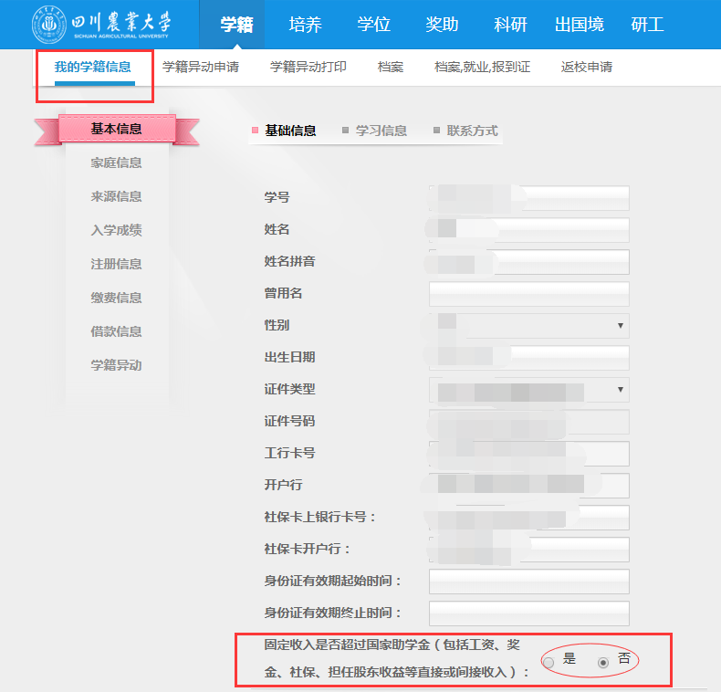 因研究生国家助学金发放情况已纳入国家审计署的审计范畴,为进一步掌握我校研究生固定工资收入情况,保障国家助学金依规、顺利、按时发放,请全日制非定向研究生在3月9日下午18:00点前登录“研究生管理系统”--“我的学籍信息”--“基本信息”点击编辑,如实确认固定收入情况并保存(操作流程见以下截图)。逾期系统将锁定,未按时按要求填报者,将视为有固定工资收入,则不具备国家助学金发放资格。