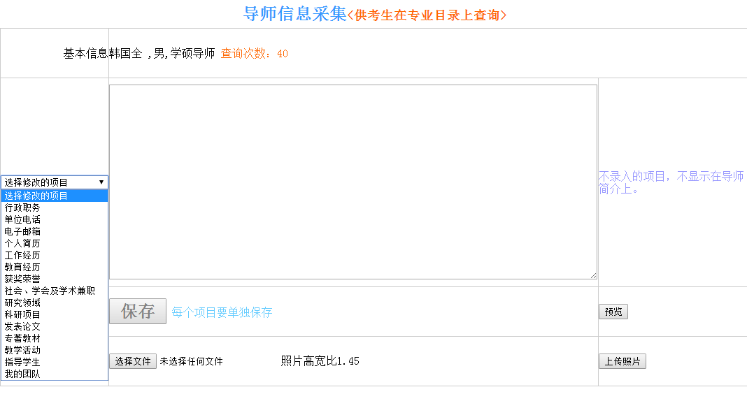 导师信息包括个人简历、工作经历、科研项目、发表论文和照片等16项内容,导师可以选择部分内容进行录入,也可全部录入。录入界面如下图: